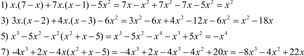 Bài 6. Thực hiện phép tính $1)~x.(7-x)+7x.(x-1)-5x^2$ $B)~3x.(x-2)+4x.(x-