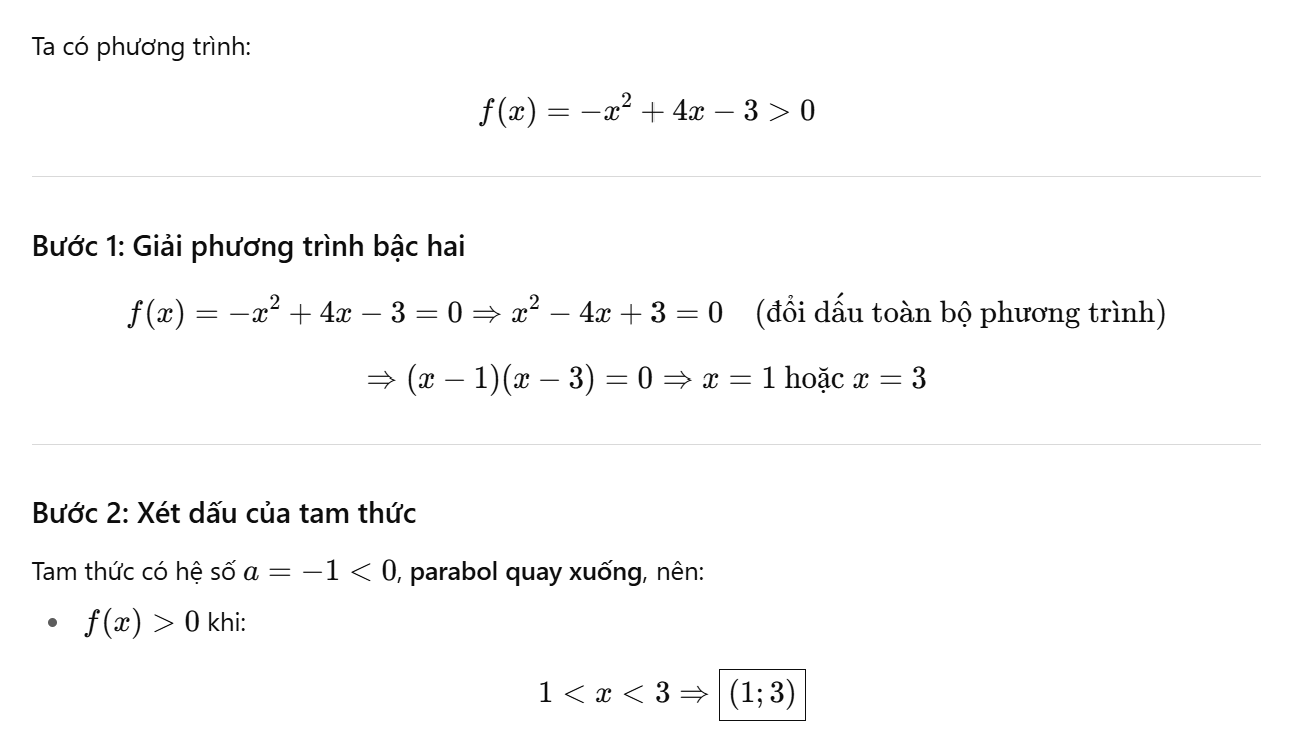 Tam thức \( -x^2 + 4x - 3 \) là một parabol mở xuống (vì hệ số của \( x^2 \) là âm). Do đó, tam thức này sẽ dương giữa hai nghiệm \( x = 1 \) và \( x = 3 \).