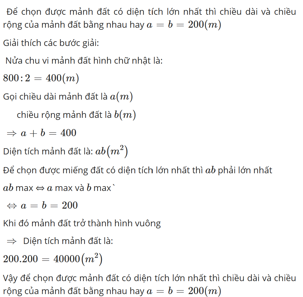 Vậy, diện tích lớn nhất đạt được khi chiều dài và chiều rộng của mảnh đất đều là 200 m. Diện tích lớn nhất là: