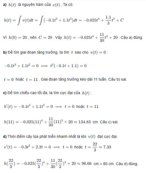 Hàm tốc độ tăng trưởng chiều cao của cây lúa là \( v(t) = -0,1t^3 + 1,1t^2 \). Chiều cao \( h(t) \) là tích phân của \( v(t) \) cộng với chiều cao ban đầu.