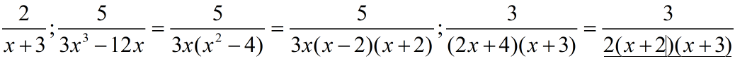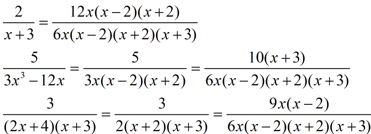- Đối với phân thức $\frac{2}{x+3}$, ta có $\frac{2 \cdot 3x(x+2)}{(x+3) \cdot 3x(x+2)} = \frac{6x(x+2)}{3x(x+2)(x+3)}$.