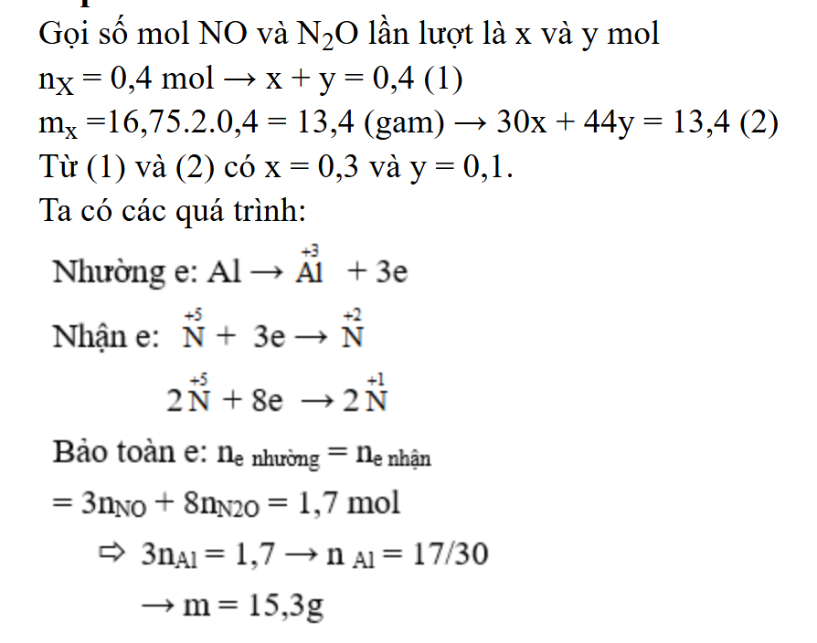 - 2 mol Al phản ứng với 3 mol NO và 2 mol N2O.