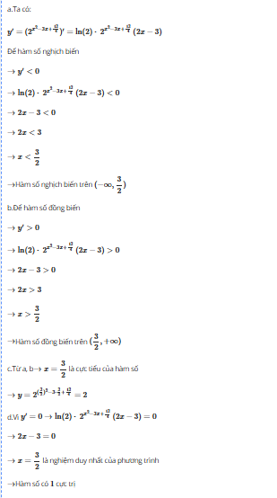 d. Vì $y' = 0 \Rightarrow \ln(2) \cdot 2^{x^2 - 3x + \dfrac{13}{4}}(2x - 3) = 0$