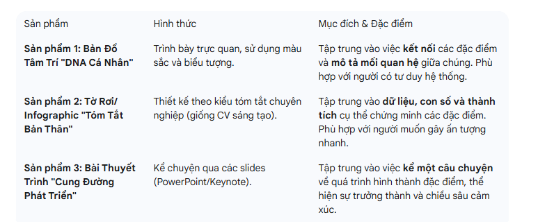 Dưới đây là một số câu hỏi giúp bạn thiết kế và trình bày sản phẩm giới thiệu đặc điểm riêng của bản thân: