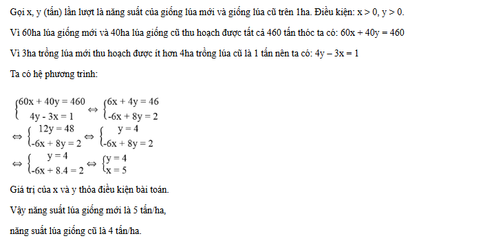 Gọi năng suất lúa giống mới trên 1 ha là x (tấn/ha, điều kiện: x > 0).