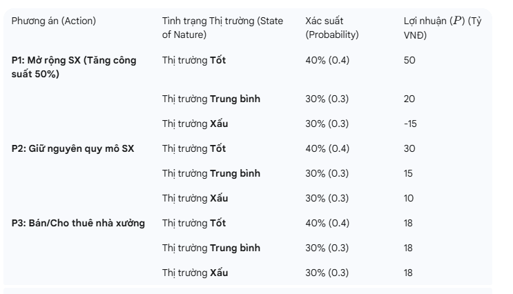 3. **Vẽ cây ra quyết định**: Từ quyết định chính, vẽ các nhánh cho từng phương án, và từ mỗi phương án vẽ nhánh cho các trạng thái thị trường với lợi nhuận dự kiến.