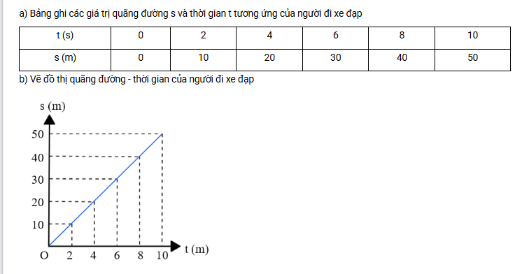 **a)** Lập bảng ghi các giá trị quãng đường \( s \) và thời gian \( t \) tương ứng của người đi xe đạp: