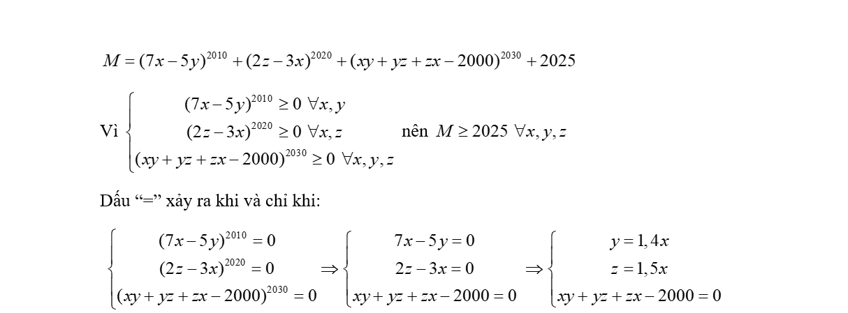 Biểu thức M có dạng tổng của các lũy thừa chẵn và hằng số 2025. Các lũy thừa chẵn luôn nhận giá trị không âm. Do đó, để M đạt giá trị nhỏ nhất, ta cần tất cả các lũy thừa đều bằng 0. Ta có: \[ (7x - 5y)^{2010} = 0 \] \[ (2z - 3x)^{2020} = 0 \] \[ (xy + yz + zx - 2000)^{2030} = 0 \] Từ đó suy ra: \[ 7x - 5y = 0 \] \[ 2z - 3x = 0 \] \[ xy + yz + zx - 2000 = 0 \] Giải hệ phương trình này, ta tìm được: \[ 7x = 5y \Rightarrow y = \frac{7x}{5} \] \[ 2z = 3x \Rightarrow z = \frac{3x}{2} \] Thay \( y = \frac{7x}{5} \) và \( z = \frac{3x}{2} \) vào phương trình cuối cùng: \[ x \left( \frac{7x}{5} \right) + \left( \frac{7x}{5} \right) \left( \frac{3x}{2} \right) + x \left( \frac{3x}{2} \right) - 2000 = 0 \] Rút gọn: \[ \frac{7x^2}{5} + \frac{21x^2}{10} + \frac{3x^2}{2} - 2000 = 0 \] Quy đồng mẫu số: \[ \frac{14x^2}{10} + \frac{21x^2}{10} + \frac{15x^2}{10} - 2000 = 0 \] \[ \frac{50x^2}{10} - 2000 = 0 \] \[ 5x^2 - 2000 = 0 \] \[ 5x^2 = 2000 \] \[ x^2 = 400 \] \[ x = 20 \text{ hoặc } x = -20 \] Do yêu cầu tìm giá trị nhỏ nhất, ta chọn \( x = 20 \): \[ y = \frac{7 \times 20}{5} = 28 \] \[ z = \frac{3 \times 20}{2} = 30 \] Thay \( x = 20 \), \( y = 28 \), \( z = 30 \) vào biểu thức M: \[ M = (7 \times 20 - 5 \times 28)^{2010} + (2 \times 30 - 3 \times 20)^{2020} + (20 \times 28 + 28 \times 30 + 30 \times 20 - 2000)^{2030} + 2025 \] \[ M = (140 - 140)^{2010} + (60 - 60)^{2020} + (560 + 840 + 600 - 2000)^{2030} + 2025 \] \[ M = 0^{2010} + 0^{2020} + 0^{2030} + 2025 \] \[ M = 0 + 0 + 0 + 2025 \] \[ M = 2025 \] Vậy giá trị nhỏ nhất của biểu thức M là 2025, đạt được khi \( x = 20 \), \( y = 28 \), \( z = 30 \).
