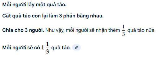 - Có 3 quả táo nhưng chia cho 4 người sao cho mỗi người đều có táo thì có thể là: