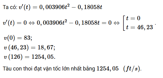 Đáp số: Giá trị lớn nhất của vận tốc là 1252,5 m/s, đạt được khi \( t = 126 \) giây.