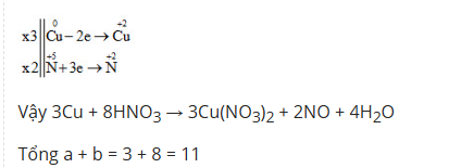 **Câu 3: Tổng (a + b) trong phản ứng $aCu + bHNO_3 \rightarrow cCu(NO_3)_2 + dNO + cH_2O$**
