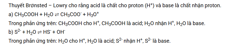 Câu 2: Xác định chất nào là acid, chất nào là base trong các phản ứng sau dựa vào thuyết acid - base của Bronsted - Lowry.