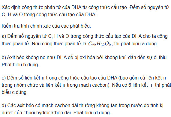 - Đúng. DHA (docosahexanoic acid) có công thức phân tử là $C_{22}H_{32}O_2$.