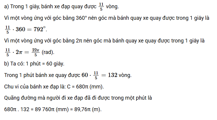 Vậy, độ dài quãng đường mà người đi xe đã đi được trong 1 phút là \( 79.2\pi \) mét.