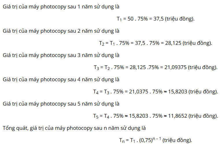 Giá trị của máy photocopy sau mỗi năm sẽ giảm đi 10% so với giá trị của năm liền trước đó. Ta có thể tính giá trị còn lại của máy photocopy sau mỗi năm theo công thức:
