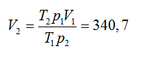\frac{p_1 V_1}{T_1} = \frac{p_2 V_2}{T_2} \Rightarrow V_2 = V_1 \frac{p_1}{p_2} \frac{T_2}{T_1}