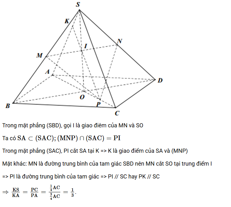 - Mặt phẳng (MNP) là mặt phẳng đi qua ba điểm M, N, P. Ta cần tìm giao điểm của mặt phẳng này với đường thẳng SA.