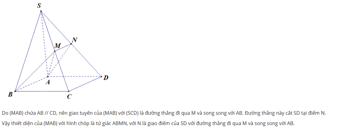 - Vì M nằm trên SD và cũng thuộc mặt phẳng (MAB) (do M là một trong các điểm xác định mặt phẳng này), nên M là điểm chung của hai mặt phẳng (MAB) và (SCD).
