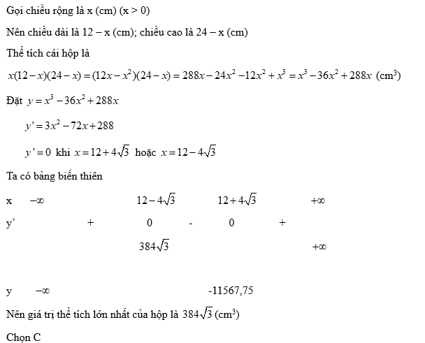 Vậy, giá trị thể tích lớn nhất của cái hộp là \( 384\sqrt{3} \). Đáp án đúng là \( C. 384\sqrt{3} \).