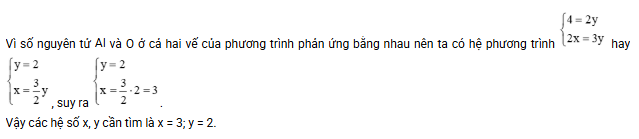 - Số nguyên tử Al ở vế trái là 4 nên số nguyên tử Al ở vế phải phải bằng 4. Từ đó suy ra y = 2.