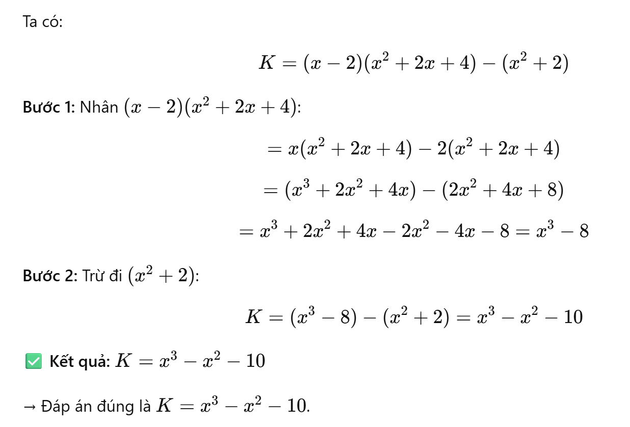 $K=\left(x-2\right)\left(x^2+2x+4\right)-\left(x^3+2\right)$