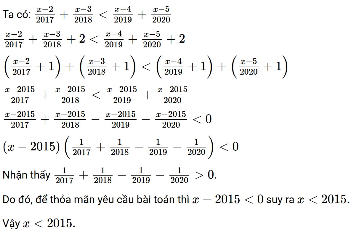 Bài 10: a) Ta có: $\frac{x-2}{2017}+\frac{x-3}{2018}< \frac{x-4}{2019}+\frac{x-5}{2020}$ $\Leftrightarrow \frac{x-2}{2017}-\frac{x-4}{2019}< \frac{x-5}{2020}-\frac{x-3}{2018}$ $\Leftrightarrow \frac{(x-2)\times 2019-(x-4)\times 2017}{2017\times 2019}< \frac{(x-5)\times 2018-(x-3)\times 2020}{2018\times 2020}$ $\Leftrightarrow \frac{2019x-4038-2017x+8068}{2017\times 2019}< \frac{2018x-10090-2020x+6060}{2018\times 2020}$ $\Leftrightarrow \frac{2x+4030}{2017\times 2019}< \frac{-2x-4030}{2018\times 2020}$ $\Leftrightarrow \frac{2(x+2015)}{2017\times 2019}< \frac{-2(x+2015)}{2018\times 2020}$ $\Leftrightarrow \frac{2(x+2015)}{2017\times 2019}+\frac{2(x+2015)}{2018\times 2020}< 0$ $\Leftrightarrow 2(x+2015)(\frac{1}{2017\times 2019}+\frac{1}{2018\times 2020})< 0$ $\Leftrightarrow x+2015< 0$ $\Leftrightarrow x< -2015$ Vậy tập nghiệm của bất phương trình là S = {x | x < -2015} b) Ta có: $\frac{x-1009}{1001}+\frac{x-4}{1003}+\frac{x+2010}{1005}\geq7$ $\Leftrightarrow \frac{x-1009}{1001}+1+\frac{x-4}{1003}+1+\frac{x+2010}{1005}+1\geq10$ $\Leftrightarrow \frac{x+1001}{1001}+\frac{x+1003}{1003}+\frac{x+1005}{1005}\geq10$ $\Leftrightarrow \frac{x}{1001}+1+\frac{x}{1003}+1+\frac{x}{1005}+1\geq10$ $\Leftrightarrow \frac{x}{1001}+\frac{x}{1003}+\frac{x}{1005}\geq7$ $\Leftrightarrow x(\frac{1}{1001}+\frac{1}{1003}+\frac{1}{1005})\geq7$ $\Leftrightarrow x\geq7:(\frac{1}{1001}+\frac{1}{1003}+\frac{1}{1005})$ Vậy tập nghiệm của bất phương trình là S = {x | x $\geq$ 7:($\frac{1}{1001}$+$\frac{1}{1003}$+$\frac{1}{1005}$)}