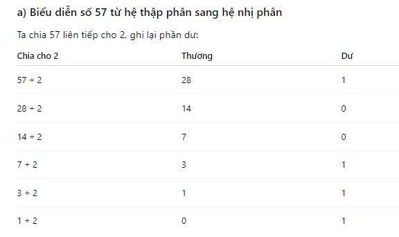 a) Biểu diễn số 57 từ hệ thập phân sang hệ nhị phân: