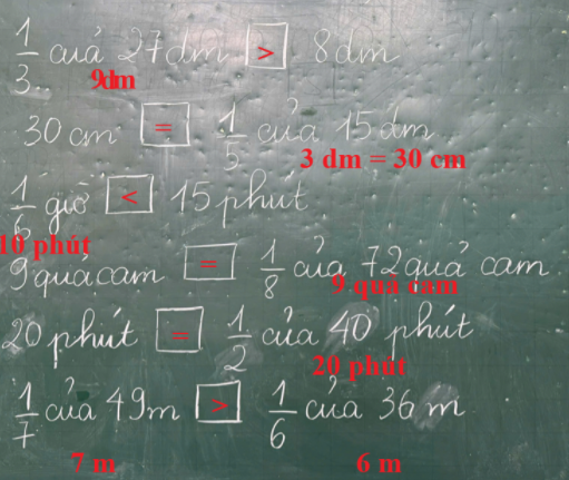 - Tính \(\frac{1}{3}\) của 27 dm: