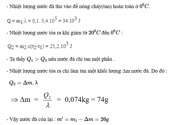 Nhiệt lượng nước cung cấp không đủ để làm tan hết đá, nên đá sẽ còn lại.