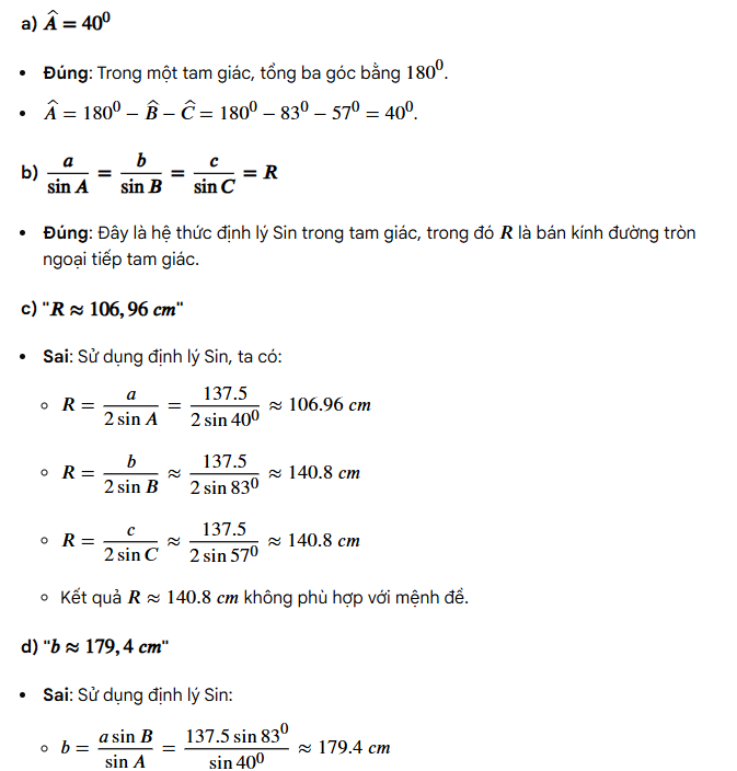 Vậy mệnh đề b) \(\frac{a}{\sin A} = \frac{b}{\sin B} = \frac{c}{\sin C} = R\) là Sai. Đúng ra phải là \(2R\).