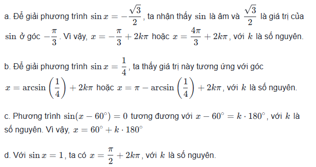 Ta biết rằng \(\sin x = -\frac{\sqrt{3}}{2}\) tại \(x = -60^\circ\) hoặc \(x = 240^\circ\) trong khoảng từ \(0^\circ\) đến \(360^\circ\).