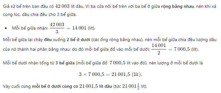 Bài 1: Đặt tính rồi tính a) \(23 : 5\) - Đặt tính chia: 23 chia 5 được 4, dư 3. - Kết quả: \(23 : 5 = 4,6\). b) \(7 : 4\) - Đặt tính chia: 7 chia 4 được 1, dư 3. - Kết quả: \(7 : 4 = 1,75\). c) \(720 : 64\) - Đặt tính chia: 720 chia 64 được 11, dư 16. - Kết quả: \(720 : 64 = 11,25\). Bài 2: Nối mỗi phép tính với kết quả của phép tính đó - \(15 : 4 = 3,75\) - \(361 : 5 = 72,2\) - \(29 : 8 = 3,625\) - \(132 : 32 = 4,125\) Bài 3: Bác Toàn trộn đậu nành - 4 yến đậu nành cần 150 g men. - Mỗi yến đậu nành cần: \(150 : 4 = 37,5\) g men. Bài 4: Bể dầu - Tổng lượng dầu ban đầu: 42 003 lít. - Chia đều cho 3 bể ở giữa: \(42 003 : 3 = 14 001\) lít mỗi bể. - Mỗi bể ở giữa chảy xuống 2 bể dưới: \(14 001 : 2 = 7 000,5\) lít mỗi bể dưới cùng. Cuối cùng, mỗi bể dưới cùng có 7 000,5 lít dầu.
