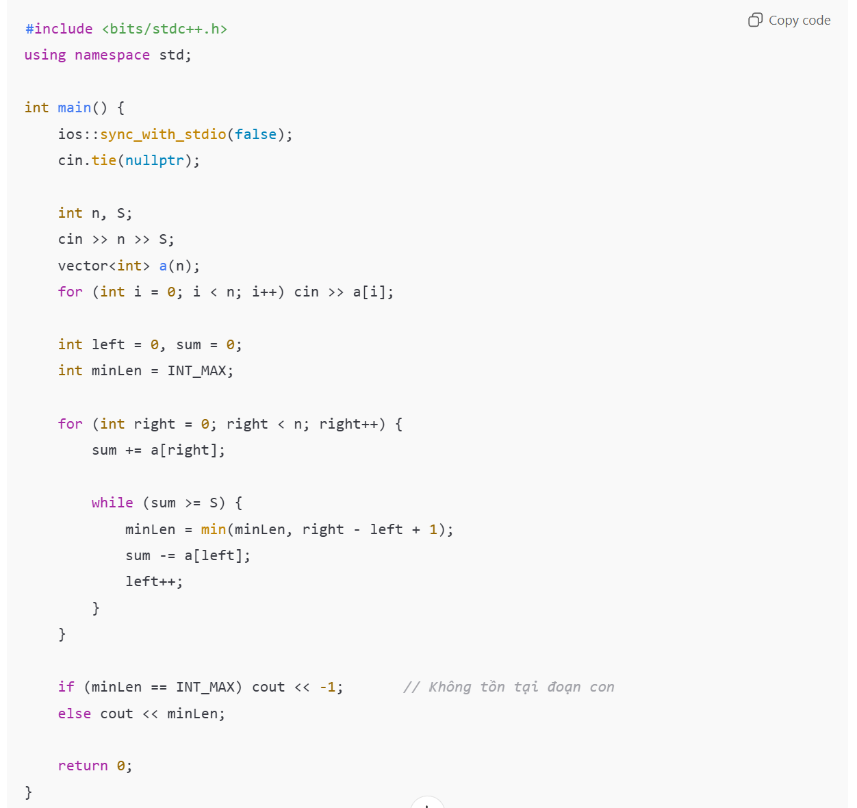 Dưới đây là đoạn code C++ giải bài toán tìm đoạn con liên tiếp có tổng lớn hơn hoặc bằng S và có độ dài ngắn nhất, áp dụng cho dãy số nguyên dương: