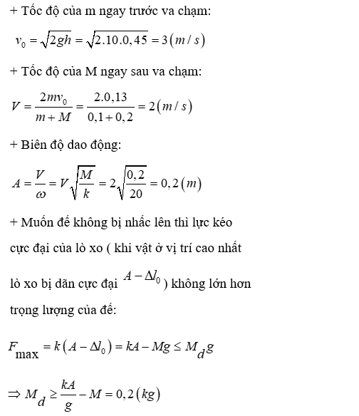 với \(x\) đo từ vị trí cân bằng, chiều dương hướng thẳng đứng xuống dưới, và gốc thời gian là lúc va chạm.