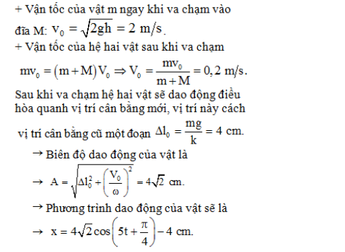 **c) Viết phương trình dao động của hai vật, chọn gốc tọa độ tại vị trí cân bằng mới, chiều dương hướng thẳng đứng từ trên xuống dưới, gốc thời gian lúc bắt đầu va chạm.**
