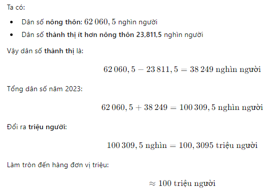 Giải thích: Dân số thành thị ít hơn dân số nông thôn 23.811,5 nghìn người, nên dân số thành thị được tính bằng dân số nông thôn trừ đi 23.811,5 nghìn người. Tổng dân số là tổng dân số nông thôn và dân số thành thị. Sau đó, đổi đơn vị sang triệu người và làm tròn đến hàng đơn vị.