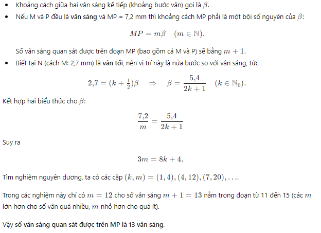 - Số vân sáng trên MP nằm trong khoảng từ 11 đến 15.