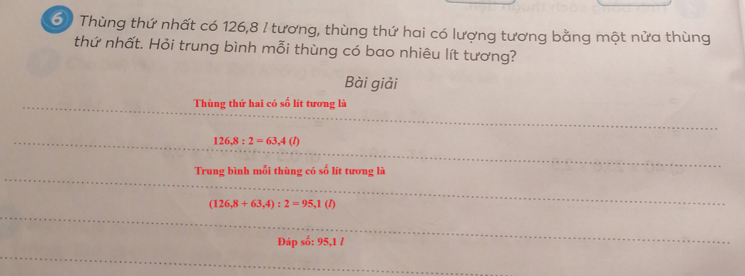 Câu 6: Thùng thứ nhất có 126,8 l tương, thùng thứ hai có lượng tương bằng một nửa thùng thứ nhất. Hỏi trung bình mỗi thùng có bao nhiêu lít tương?