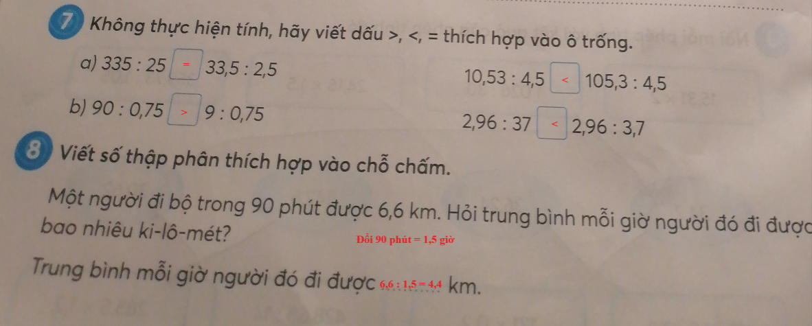 Đáp án: 335 : 25 > 10,53 : 4,5 < 105,3 : 4,5
