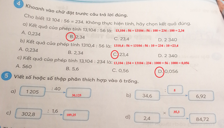 - Do đó, kết quả của phép tính 13,104 : 234 sẽ là 0,056.