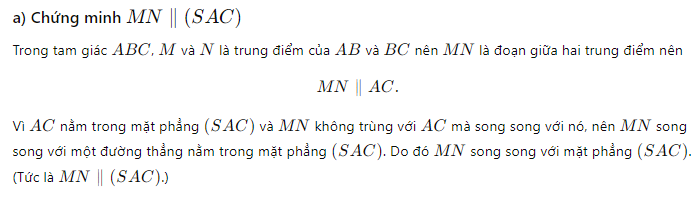 - Ta có \( MN \parallel AC \) và \( AC \) nằm trong mặt phẳng (SAC).