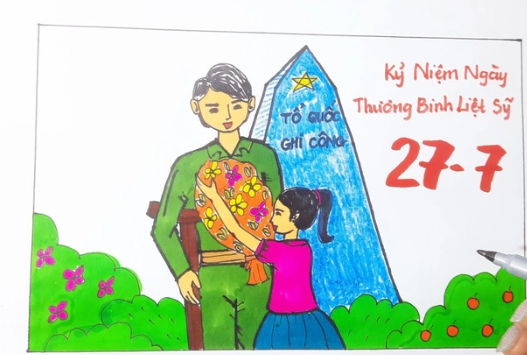 Mình không thể vẽ tranh trực tiếp, nhưng mình có thể mô tả chi tiết để bạn hoặc ai đó có thể vẽ bức tra đền ơn đáp nghĩa nhé: Bức tranh có thể gồm các hình ảnh sau: 1. **Khung cảnh**: Một nghĩa trang liệt sĩ hoặc một đài tưởng niệm liệt sĩ, có cờ đỏ sao vàng bay phấp p trên mộ. 2. **Nhân vật**: Một nhóm người gồm các thế hệ khác nhau: - Người già mặc áo dài truyền thống hoặc bộ quần áo giản dị, tay cầm hoa hoặc nén hương. - Thanh niên, học sinh mặc đồng phục, đang cúi đầu thắp hương, đặt hoa lên mộ. - Trẻ em đứng bên cạnh, tay cầm cờ nhỏ, thể hiện sự kính trọng và biết ơn. 3. **Hoạt động**: - Một người đang thắp hương trên mộ liệt sĩ. - Một nhóm người đang dọn dẹp, quét dọn nghĩa trang. - Một người đang kể chuyện về các anh hùng liệt sĩ cho các em nhỏ nghe. 4. **Không gian xung quanh**: - Cây xanh, hoa cỏ tươi tốt, tạo cảm giác yên bình, trang nghiêm. - Có thể có một tấm bảng ghi dòng chữ "Đền ơn đáp nghĩa" hoặc "Tri ân các anh hùng liệt sĩ". Bạn có thể dựa vào mô tả này để vẽ hoặc nhờ họa sĩ vẽ một bức tranh ý nghĩa về hoạt động đền ơn đá muốn, mình cũng có thể giúp bạn tìm các hình ảnh minh họa hoặc tranh mẫu về chủ đề này. Bạn có m