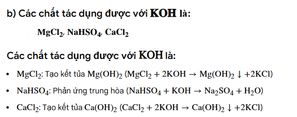 **Kết luận**: Các chất tác dụng được với $KOH$ là: $MgCl_2, Ba(NO_3)_2, NaHSO_4, CaCl_2$.