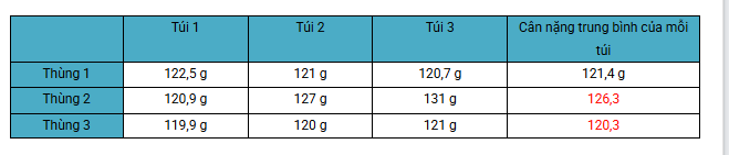 | Thùng 3 | 119,9 g | 120 g | 121 g | 120,3 g |