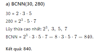 - Lấy tất cả các thừa số nguyên tố chung và riêng với số mũ lớn nhất: