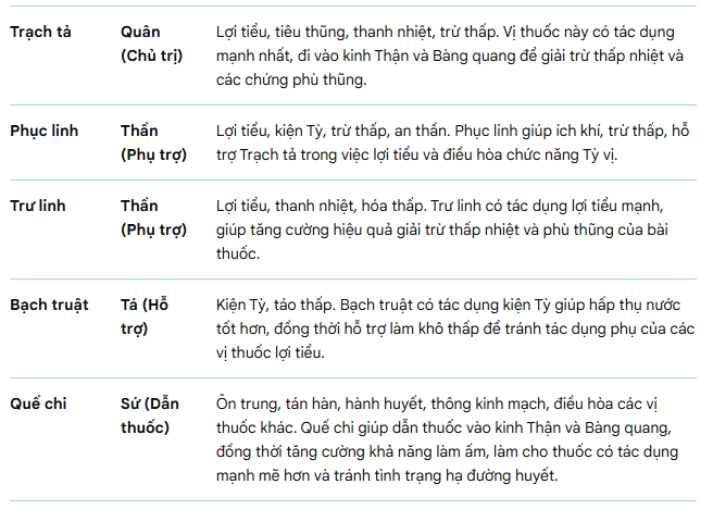 - **Trạch tả (16g)**: Có tác dụng lợi tiểu, giúp thanh nhiệt và tiêu trừ ẩm ướt trong cơ thể. Trạch tả cũng giúp hỗ trợ chức năng thận.