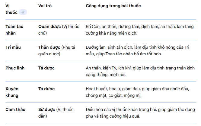 - **Toan táo nhân (12g)**: Đây là vị thuốc chính trong bài thuốc, có tác dụng an thần, hỗ trợ giấc ngủ và làm dịu thần kinh. Toan táo nhân giúp giảm lo âu, căng thẳng, mang lại cảm giác thư giãn cho người sử dụng.
