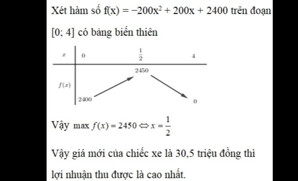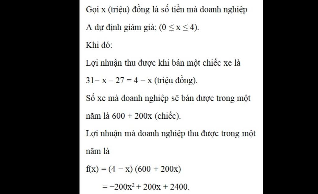 - Doanh thu từ việc bán xe là: \( (31 - x)(600 + 200x) \) triệu đồng.
