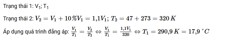 - Định luật Charles: \( \frac{V_1}{T_1} = \frac{V_2}{T_2} \Rightarrow T_1 = T_2 \frac{V_1}{V_2} = 320 \times \frac{1}{1.1} = 290.9 K \)