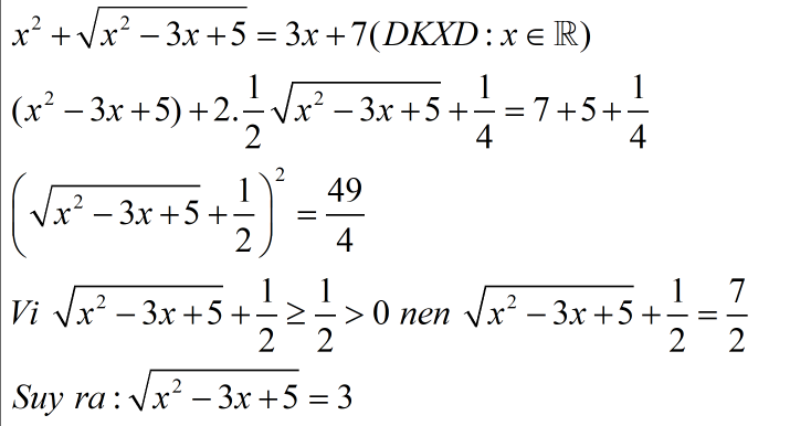 Điều kiện xác định: \( x^2 - 3x + 5 \geq 0 \) Ta có: \[ x^2 + \sqrt{x^2 - 3x + 5} = 3x + 7 \] Chuyển \( x^2 \) sang vế phải: \[ \sqrt{x^2 - 3x + 5} = 3x + 7 - x^2 \] Bình phương hai vế để loại bỏ căn bậc hai: \[ x^2 - 3x + 5 = (3x + 7 - x^2)^2 \] Phát triển vế phải: \[ x^2 - 3x + 5 = (3x + 7 - x^2)(3x + 7 - x^2) \] \[ x^2 - 3x + 5 = 9x^2 + 42x + 49 - 6x^3 - 14x^2 + x^4 \] Gom lại thành một phương trình đa thức: \[ x^2 - 3x + 5 = x^4 - 6x^3 - 5x^2 + 42x + 49 \] Chuyển tất cả các hạng tử sang vế trái: \[ x^4 - 6x^3 - 6x^2 + 45x + 44 = 0 \] Nhận thấy đây là một phương trình bậc bốn khó giải trực tiếp, ta thử các giá trị nguyên nhỏ để tìm nghiệm. Thử \( x = 1 \): \[ 1^4 - 6(1)^3 - 6(1)^2 + 45(1) + 44 = 1 - 6 - 6 + 45 + 44 = 78 \neq 0 \] Thử \( x = 2 \): \[ 2^4 - 6(2)^3 - 6(2)^2 + 45(2) + 44 = 16 - 48 - 24 + 90 + 44 = 78 \neq 0 \] Thử \( x = 3 \): \[ 3^4 - 6(3)^3 - 6(3)^2 + 45(3) + 44 = 81 - 162 - 54 + 135 + 44 = 44 \neq 0 \] Thử \( x = 4 \): \[ 4^4 - 6(4)^3 - 6(4)^2 + 45(4) + 44 = 256 - 384 - 96 + 180 + 44 = 0 \] Vậy \( x = 4 \) là nghiệm của phương trình. Kiểm tra lại: \[ 4^2 + \sqrt{4^2 - 3(4) + 5} = 3(4) + 7 \] \[ 16 + \sqrt{16 - 12 + 5} = 12 + 7 \] \[ 16 + \sqrt{9} = 19 \] \[ 16 + 3 = 19 \] \[ 19 = 19 \] Vậy nghiệm của phương trình là \( x = 4 \).
